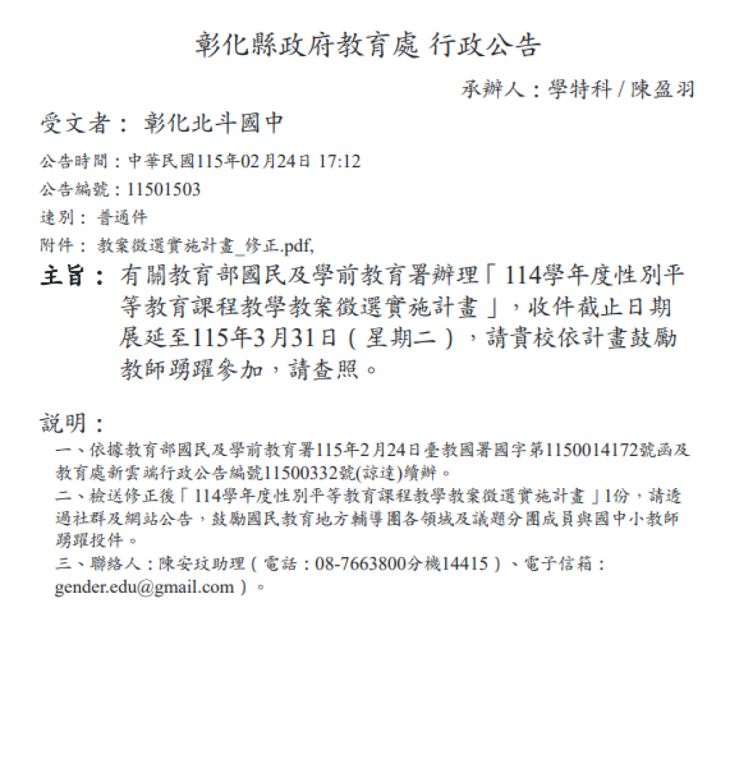 二、檢送修正後「114學年度性別平等教育課程教學教案徵選實施計畫」1份,請透過社群及網站公告,鼓勵國民教育地方輔導團各領域及議題分團成員與國中小教師踴躍投件。