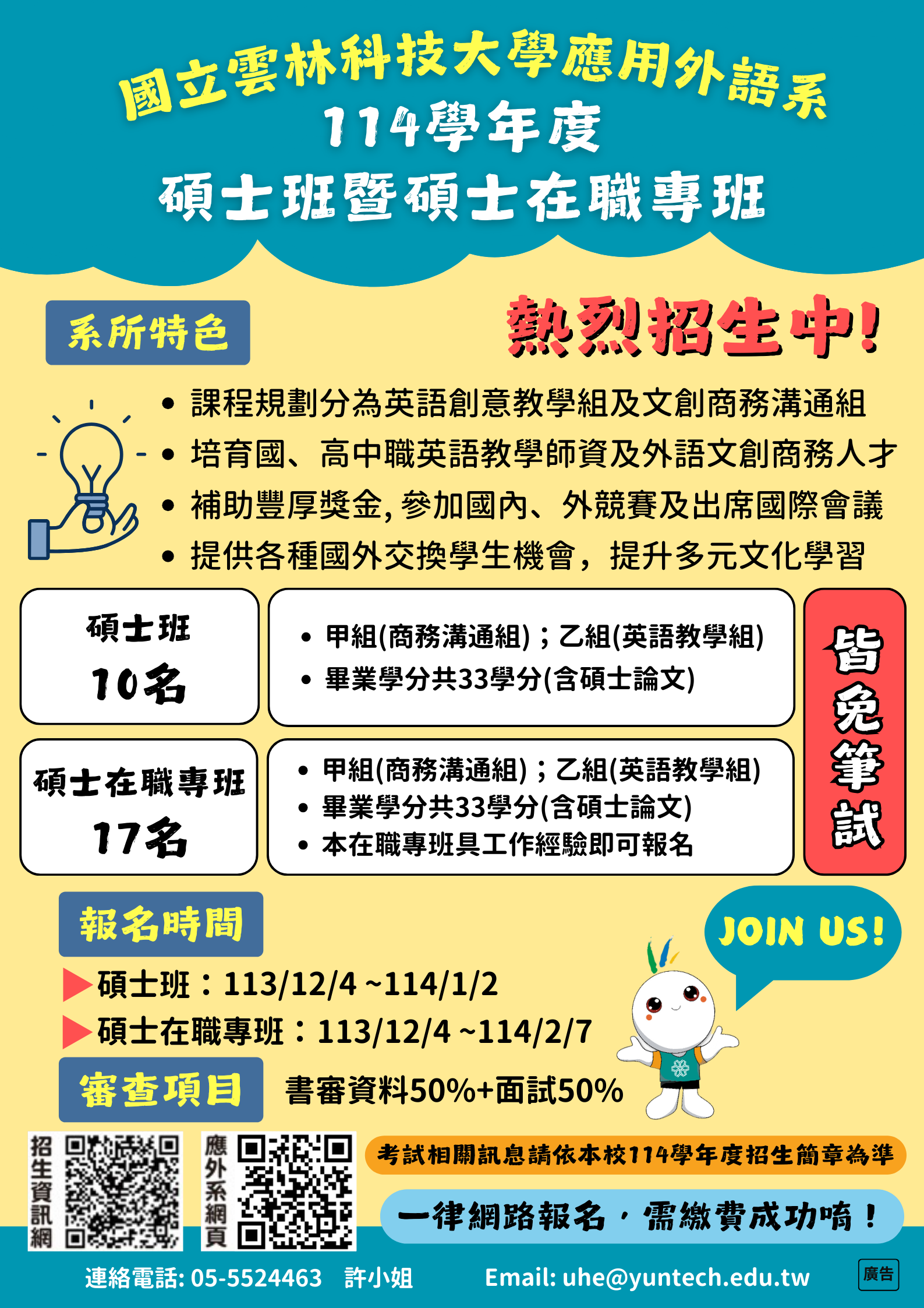 轉知國立雲林科技大學應用外語系114學年度碩士在職專班招生資訊