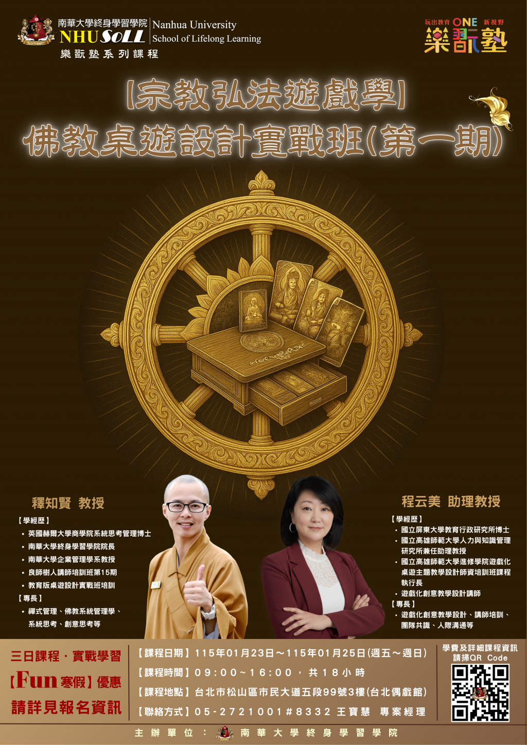 轉知南華大學115年1月份開辦之「【宗教弘法遊戲學】佛教桌遊設計實戰班(第一期)」課程資訊