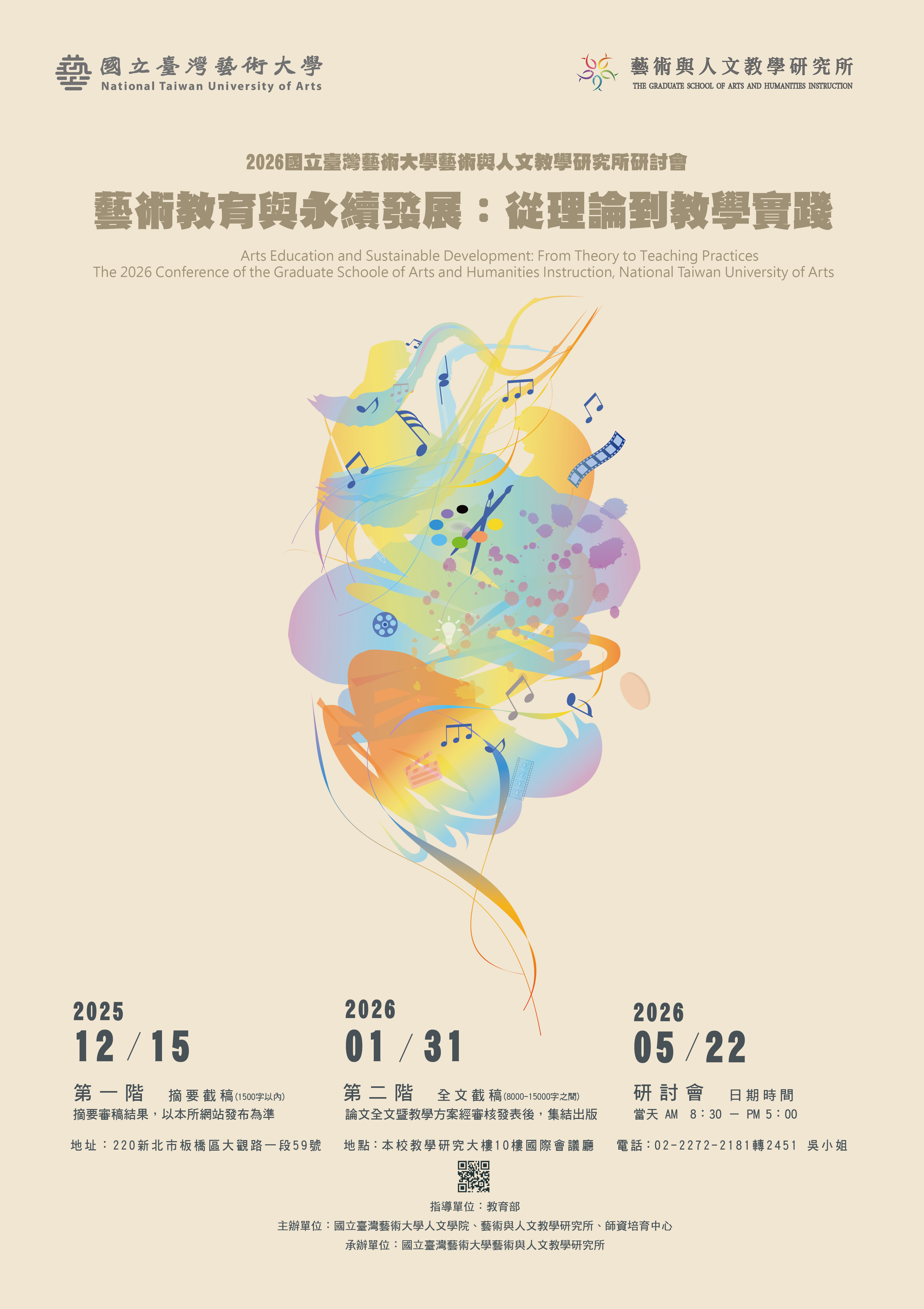 | 二、 | 旨揭研討會由國立臺灣藝術大學藝術與人文教學研究所承辦,訂於115年5月22日(星期五)上午8時至下午5時,於該校教學研究大樓10樓國際會議廳舉行。 |