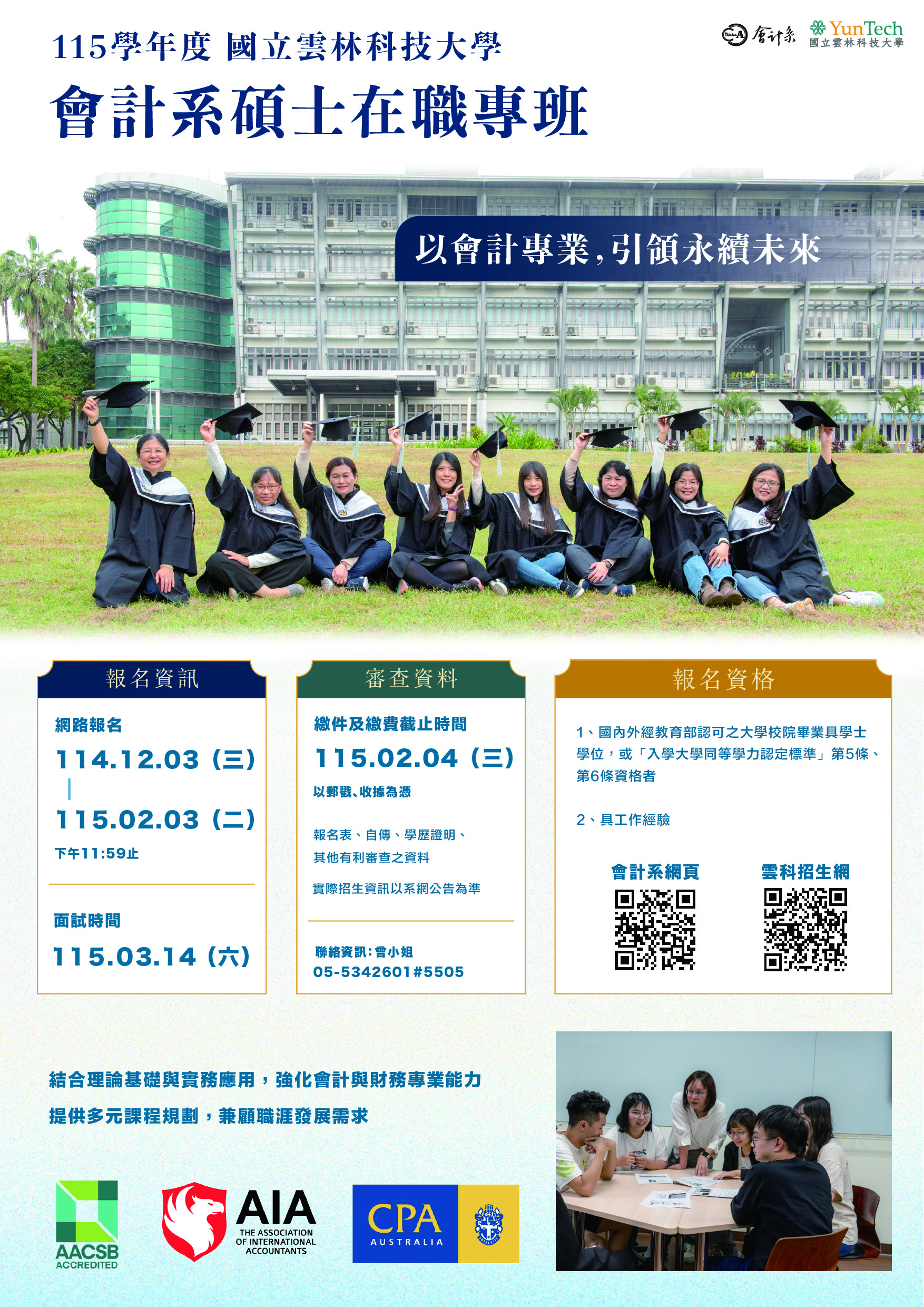 轉知國立雲林科技大學會計系115學年度碩士在職專班招生資訊