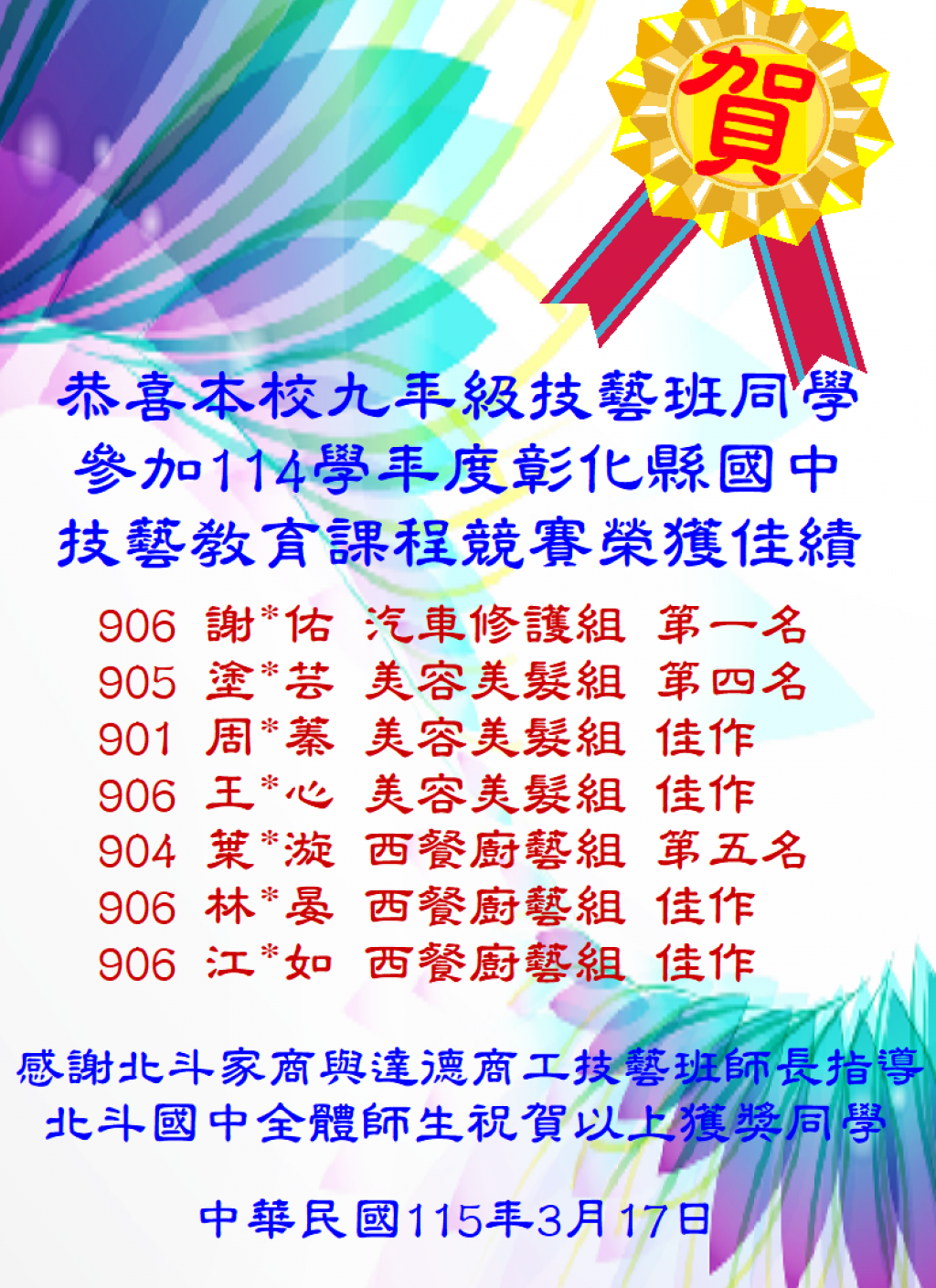 本校九年級技藝班同學參加「114學年度彰化縣國中技藝教育課程競賽」,表現優異,榮獲多項佳績,特此表揚: