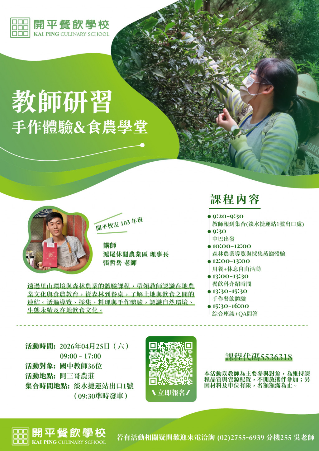 | 四、 | 報名方式:採線上報名,請上“全國教師在職進修資訊網”報名,課程名稱:餐飲教師研習_食農學堂&手作體驗。報名截止日期:115年04月22日(三),課程名單將於開課前三天確認遴選名單。 |