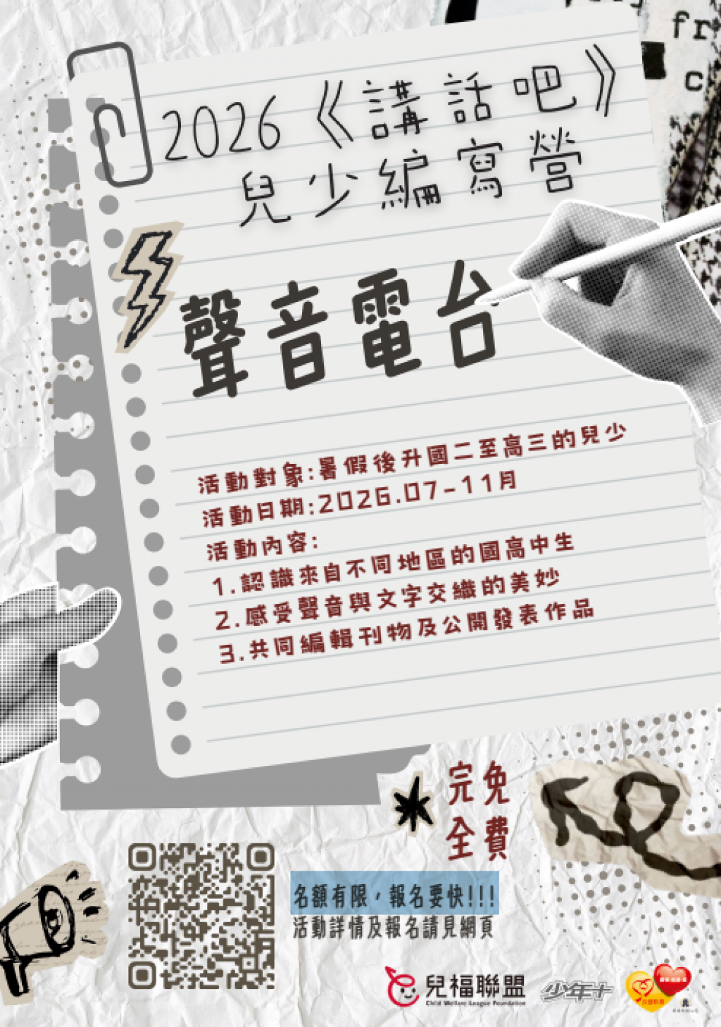 | 二、 | 本會希望透過編寫營的活動,邀請全國暑假後升國二至高三的兒少,透過文字的方式,表達自己對生活的觀察和感受。而參與培力的兒少之作品,將有機會刊登在本會和兒少共同編輯的刊物中,讓更多大人了解到兒少的世界和聲音。 |